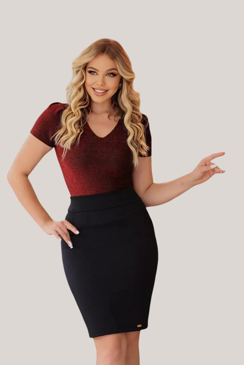 Conjunto: Saia secretária com bolsos laterais, fenda e pences na parte de trás, confeccionada em montaria com elastano. Blusa em malha lurex, pregas na manga e gola V.