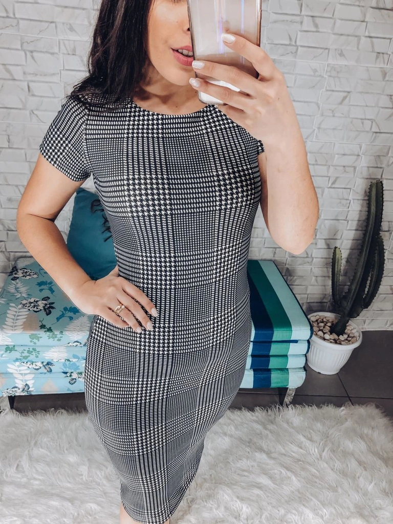 Vestido tubinho midi estampado confeccionado em malha montaria com elastano. Modelagem reta,  mangas curtas, gola redonda, malha grossinha encorpada. Não possui zíper nem forro. Um vestido básico que toda mulher moderna precisa ter.